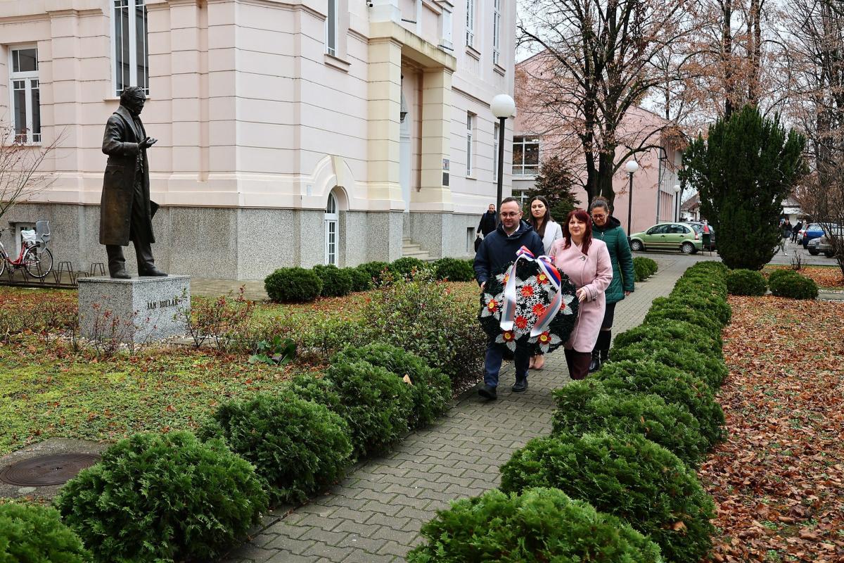 Predstavitelia lokálnej samosprávy – predsedníčka obce Viera Krstovská a predseda Zhromaždenia obce Michal Hataľa, ako aj riaditeľka gymnázia Daniela Marková položili veniec k pamätníku na školskom dvore.