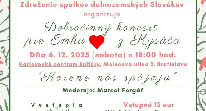 Združenie spolkov dolnozemských Slovákov organizuje dobročinný koncert pod názvom Korene nás spájajú, ktorý bude venovaný pomoci päťročnej Eme Medveďovej z Kysáča. Toto podujatie má za cieľ spojiť priateľov, krajanov a všetkých dobrých ľudí v spoločnom geste solidarity a lásky. Koncert sa uskutoční v sobotu 6. decembra o 18. hodine v Karloveskom centre kultúry na Molecovej ulici 2 v Bratislave. Symbolický názov Korene nás spájajú vyjadruje myšlienku spolupatričnosti a empatie, ktoré dokážu priniesť nádej aj v ťažkých chvíľach.
