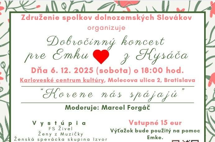 Združenie spolkov dolnozemských Slovákov organizuje dobročinný koncert pod názvom Korene nás spájajú, ktorý bude venovaný pomoci päťročnej Eme Medveďovej z Kysáča. Toto podujatie má za cieľ spojiť priateľov, krajanov a všetkých dobrých ľudí v spoločnom geste solidarity a lásky. Koncert sa uskutoční v sobotu 6. decembra o 18. hodine v Karloveskom centre kultúry na Molecovej ulici 2 v Bratislave. Symbolický názov Korene nás spájajú vyjadruje myšlienku spolupatričnosti a empatie, ktoré dokážu priniesť nádej aj v ťažkých chvíľach.