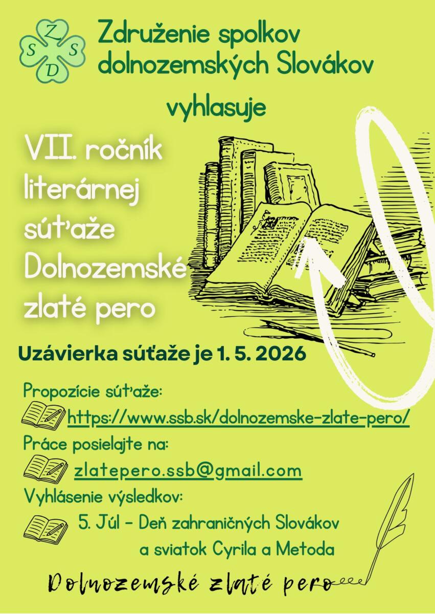 Združenie spolkov dolnozemských Slovákov vyhlásilo 7. ročník literárnej súťaže Dolnozemské zlaté pero, určenej pre dolnozemských Slovákov s cieľom podporiť ich literárnu tvorbu a vzťah k materinskému jazyku.