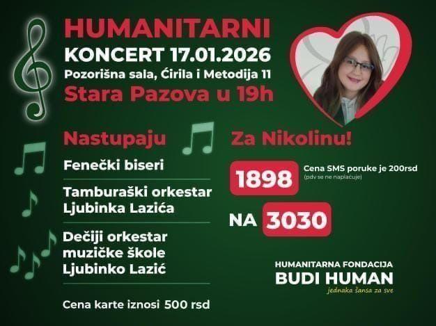 V staropazovskej divadelnej sále sa v sobotu 17. januára o 19.00 hodine uskutoční humanitárny koncert na pomoc Nikoline z Krnješeviec. Na koncerte vystúpia Fenečki Biseri, Tamburášsky orchester Ljubinka Lazića, ako aj Detský orchester Hudobnej školy Ljubinka Lazića.