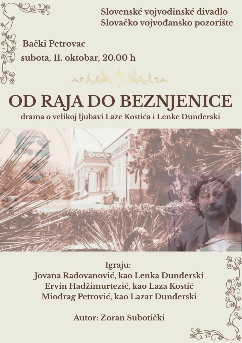 Zo Slovenského vojvodinského divadla oboznamujú, že v pokračovaní divadelného festivalu 30. PDD v sobotu 11. októbra v SVD si možno pozrieť divadelnú hru Zorana Subotického o milostnej dráme Lenky Dunđerskej a Lazu Kostića Od raja do beznjenice.