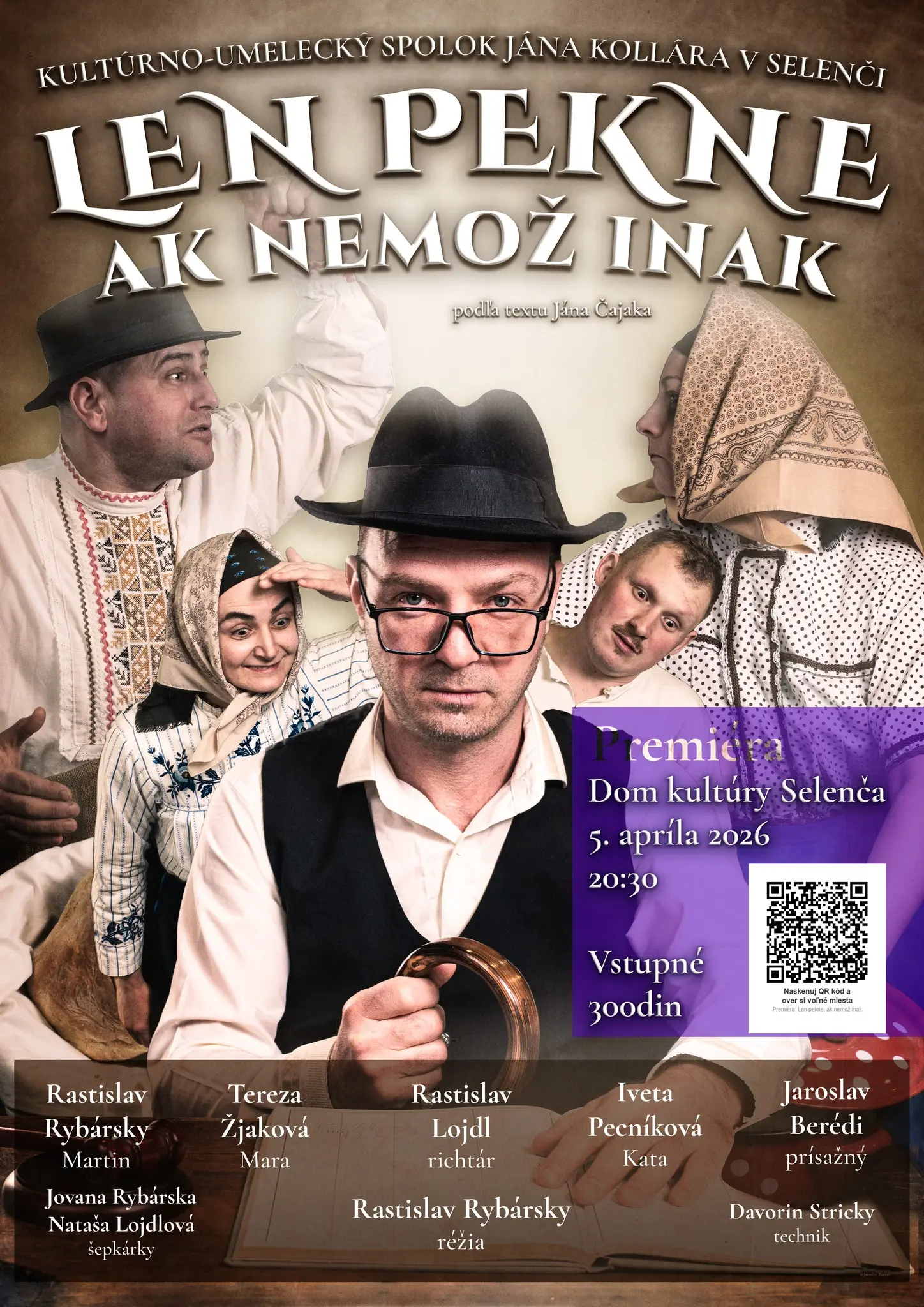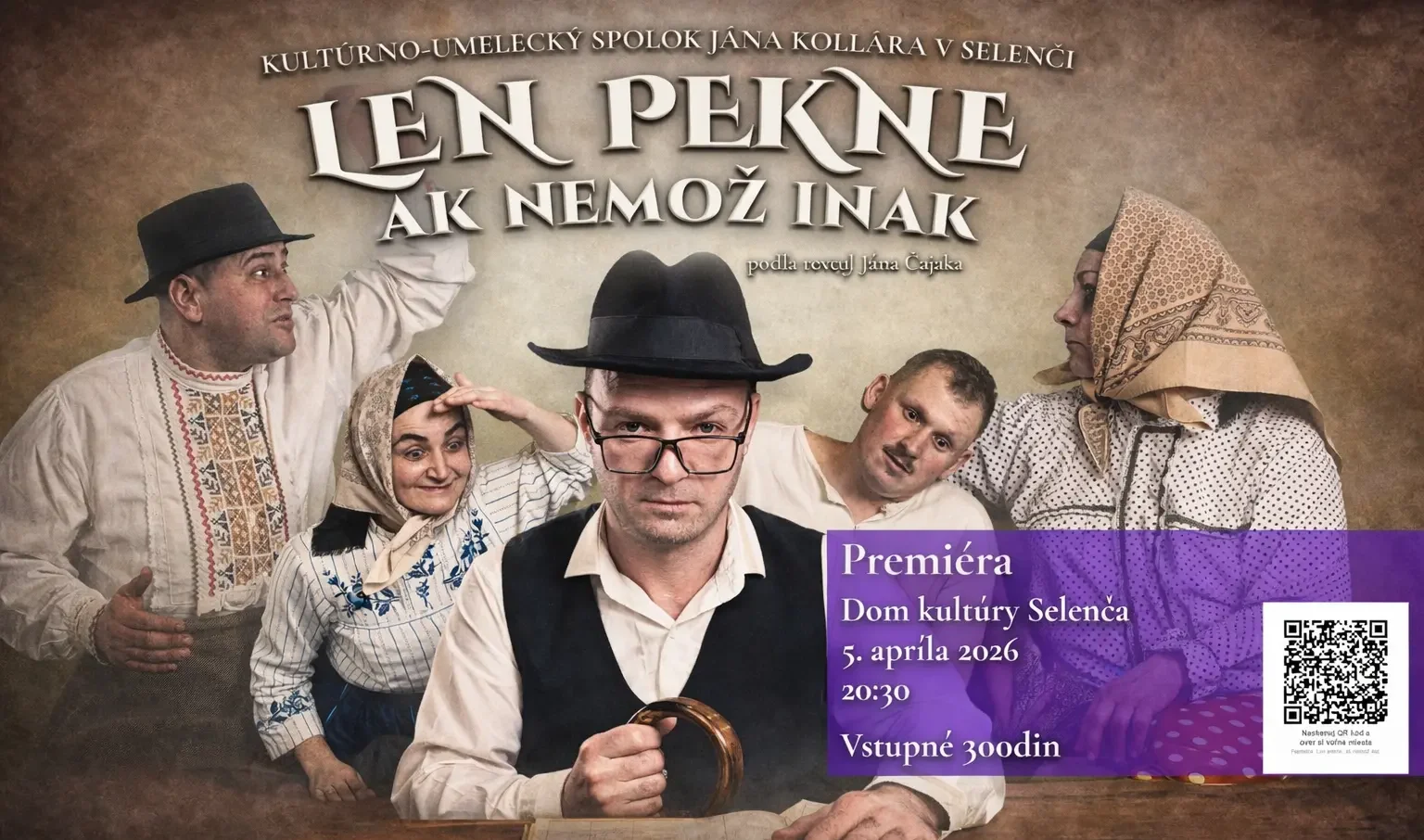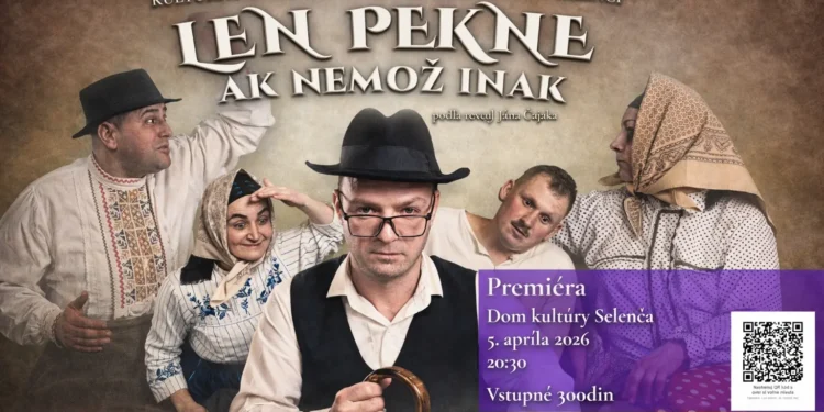 Premiéra divadelného predstavenia Len pekne, ak nemož inak v podaní Kultúrno-umeleckého spolku Jána Kollára v Selenči sa uskutoční na Veľkonočnú nedeľu 5. apríla o 20.30 h v Dome kultúry v Selenči.