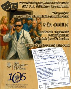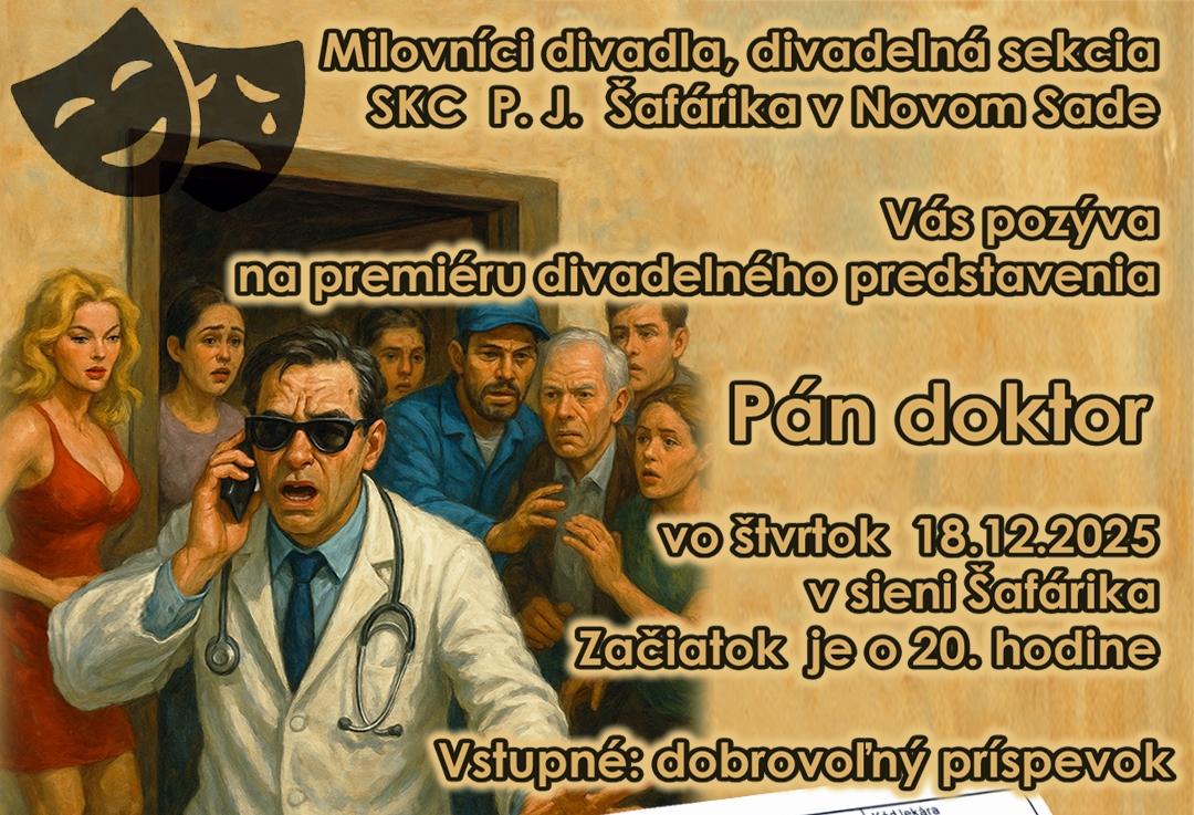 Vo štvrtok 18. decembra 2025 o 20. hodine sa vo veľkej sieni Slovenského kultúrneho centra Pavla Jozefa Šafárika v Novom Sade uskutoční premiéra divadelného predstavenia Pán doktor v réžii Rastislava Zorňana.