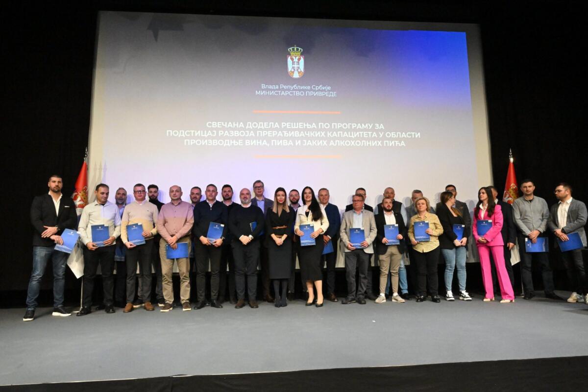 Prezident Srbska Aleksandar Vučić dnes slávnostne odovzdal rozhodnutia príjemcom prostriedkov v rámci programu na podporu rozvoja spracovateľských kapacít v oblasti výroby vína, piva a tvrdých alkoholických nápojov za rok 2025 a oznámil, že úverové prostriedky na pomoc budú zvýšené z 10 na 20 miliónov dinárov.