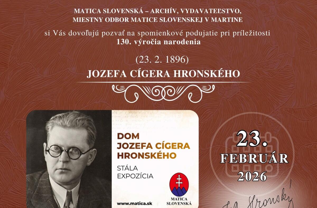 Matica slovenská – Archív a Vydavateľstvo spolu s Miestnym odborom Matice slovenskej v Martine pozývajú na spomienkové podujatie venované životu a dielu významného slovenského spisovateľa a národného dejateľa Jozefa Cígera Hronského v pondelok 23. februára 2026 so začiatkom o 13.15 hodine na Národnom cintoríne v Martine.