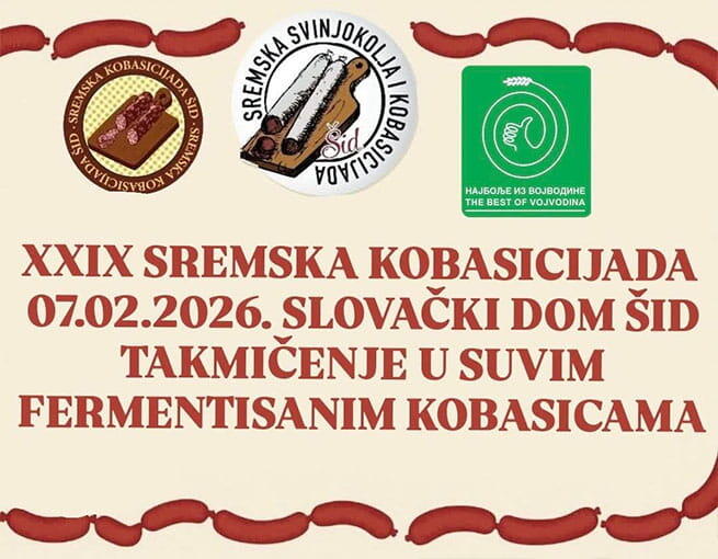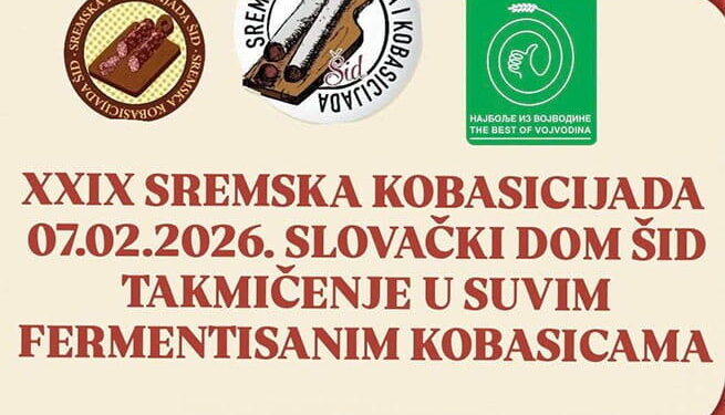 Podujatie 29. Sriemska klobasiáda v Šíde sa uskutoční v sobotu 7. februára v Slovenskom dome v Šíde, v organizácii Občianskeho združenia Sremski svinjokolj i kobasicijada.