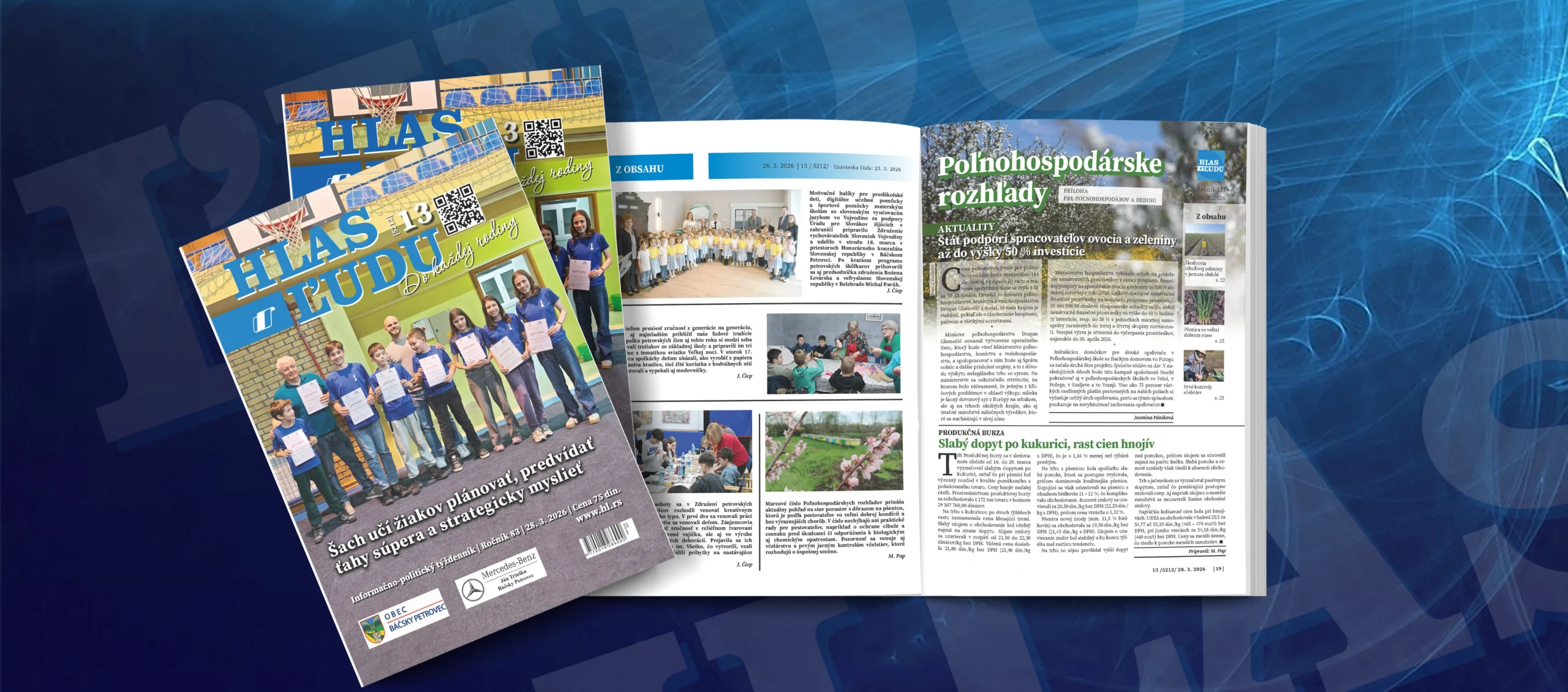 Na stranách rubriky Naše dediny si čitatelia môžu nájsť texty o dielňach v Spolku petrovských žien k Veľkej noci, o motivačných balíkoch pre predškolské deti, ktoré odovzdali v priestoroch Honorárneho konzulátu Slovenskej republiky v Báčskom Petrovci, prednáške na petrovskom gymnáziu o umelej inteligencii. V Základnej škole J8na Čajaka v Petrovci minulý víkend sa konala obvodná súťaž v šachu, v Kovačici rovnali poľné cesty, v Hložanoch uskutočnili výročné zhromaždenie poľnohospodárov.