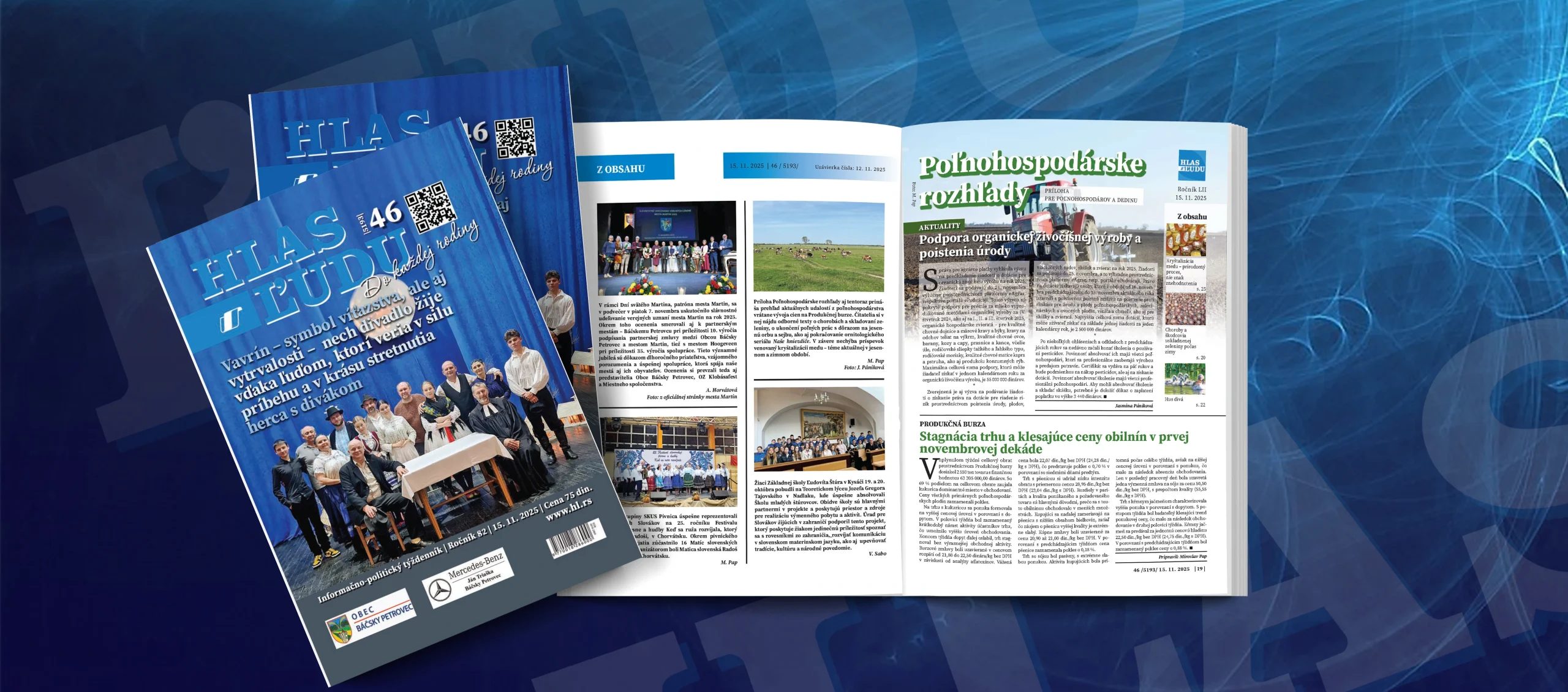 Titulnú stranu tretieho novembrového čísla Hlasu ľudu zdobí fotografia z 55. ročníka Prehliadky slovenskej ochotníckej divadelnej tvorby Divadelný vavrín, na ktorej sa nachádzajú členovia Slovenského divadla VHV, SKUS hrdinu Janka Čmelíka a Strediska pre kultúru Stará Pazova, ktorí zahrali divadelné prestavenie Zem a získali početné ceny. Obsiahlejší príspevok z podujatia prinášame v rubrike Kultúra.