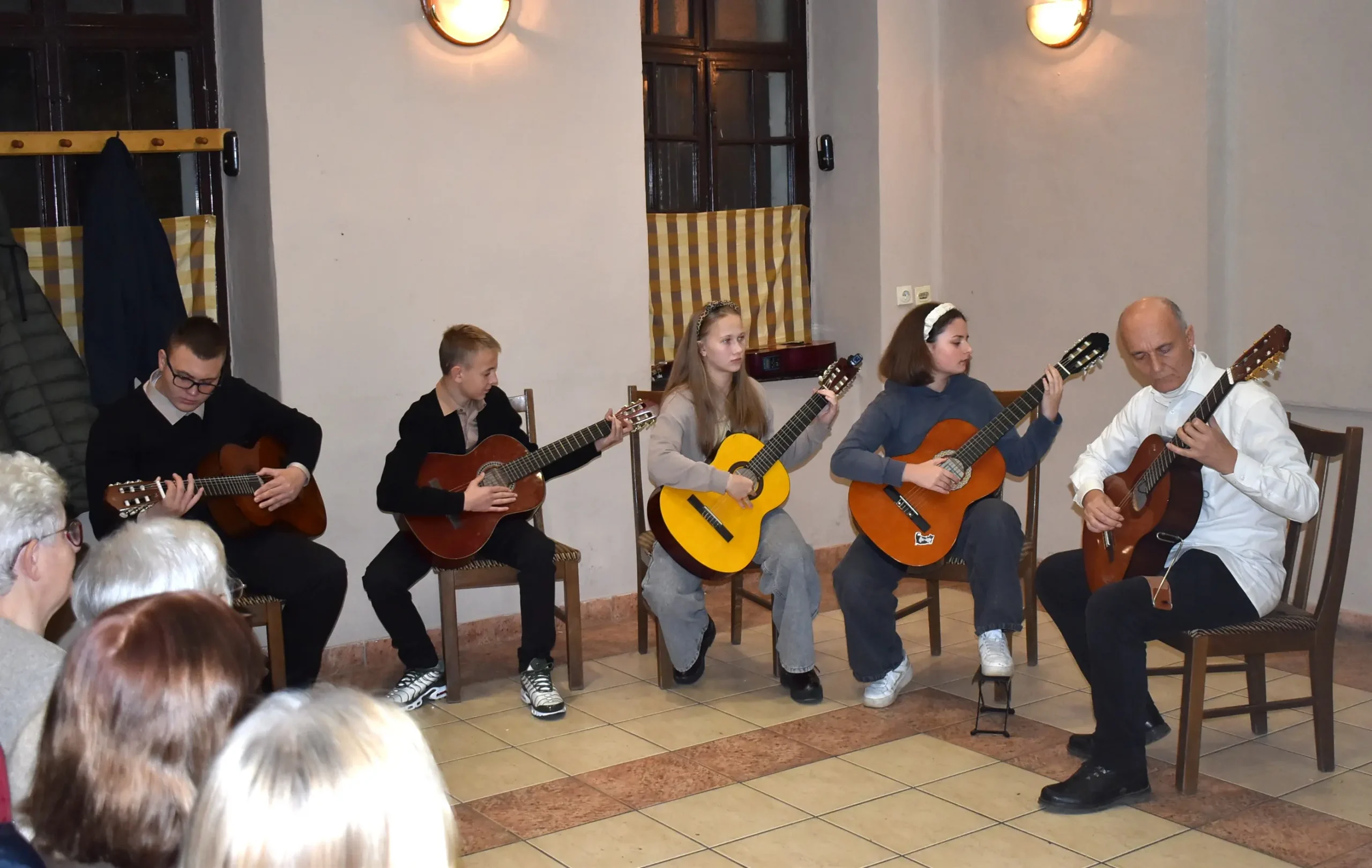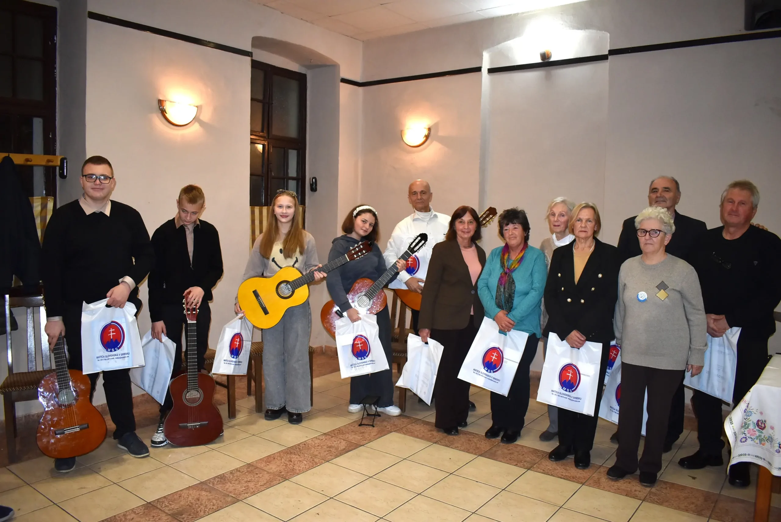 Večierok ozvláštnili aj hudobné body mladých gitaristov, ktorých pred niekoľkými mesiacmi zoskupil a nacvičuje Marko Šalić z Klubu klasickej gitary Akord z Báčskej Palanky. Skupinu gitaristov tvoria Stanislav a Filip Balcovci, Emanuela Anna Balážová a Mia Saračová, ktorá zaspievala aj jednu ľudovú pieseň a spoločne na gitarách zahrali niekoľko pesničiek.