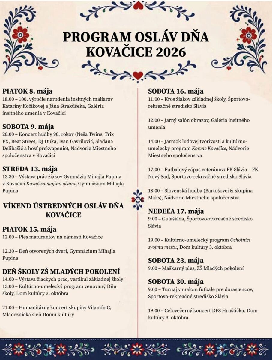 Program ponúkne aj tradičný jarmok ľudovej tvorivosti Korene Kovačice, kultúrno-umelecké vystúpenia vrátane programu Ochotníci svojmu mestu, ako aj pestré školské podujatia – ples maturantov, deň otvorených dverí na kovačickom gymnáziu, výstavu žiackych prác, či program ku Dňu školy ZŠ Mladých pokolení.